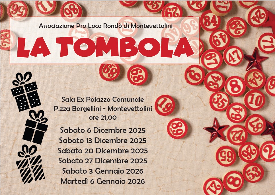 La Pro Loco Rondò di Montevettolini è lieta di annunciare il ritorno di uno degli appuntamenti più attesi del periodo natalizio: le tradizionali Serate di Tombola, un’occasione per vivere insieme lo spirito delle feste tra divertimento, comunità e premi gustosissimi!